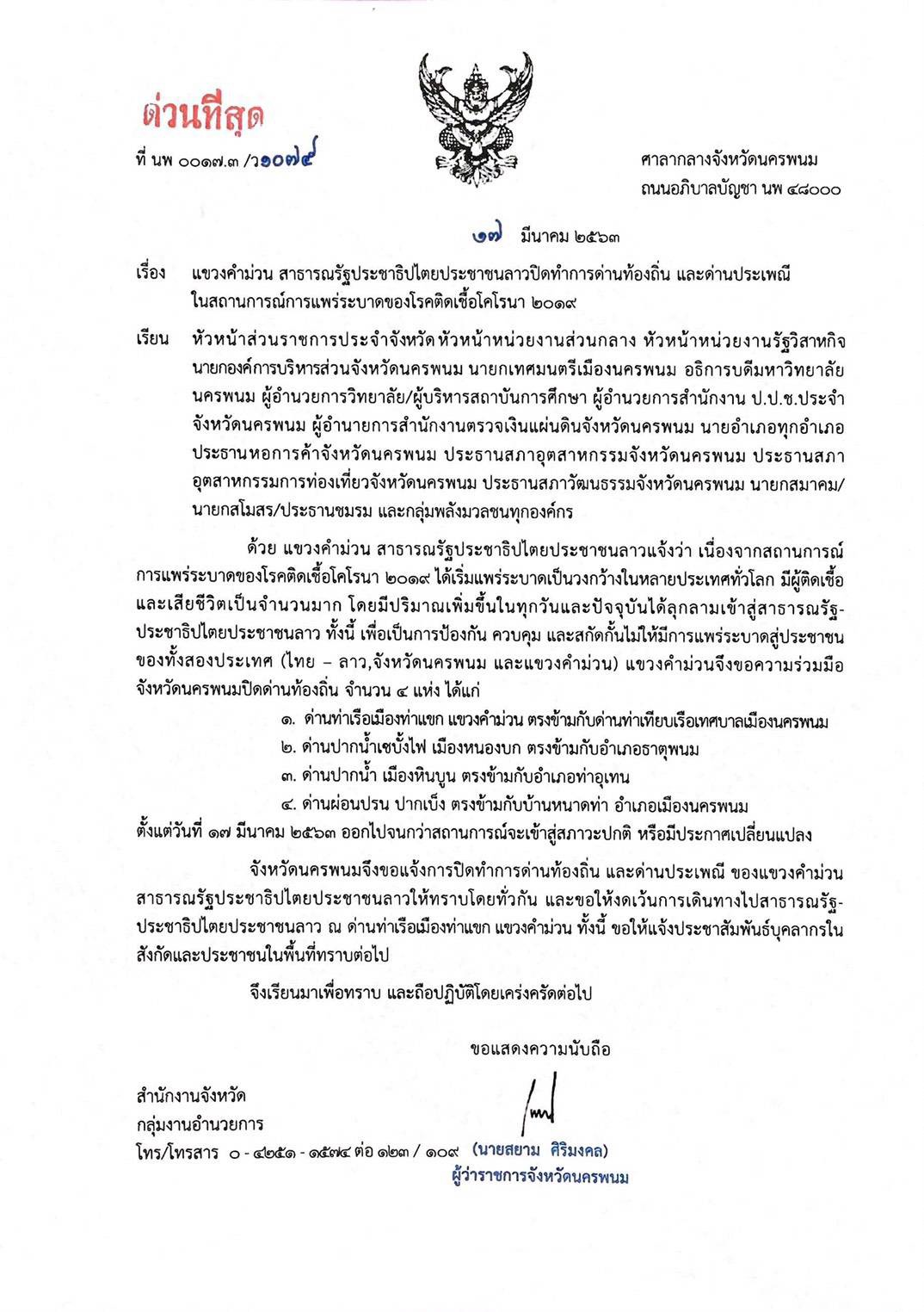 แขวงคำม่วน สาธารณรัฐประชาธิปไตยประชาชนลาวปิดทำการด่านท้องถิ่น และด่านประเพณี ในสถานการณ์การแพร่ระบาดของโรคติดเชื้อโคโรน่า 2019