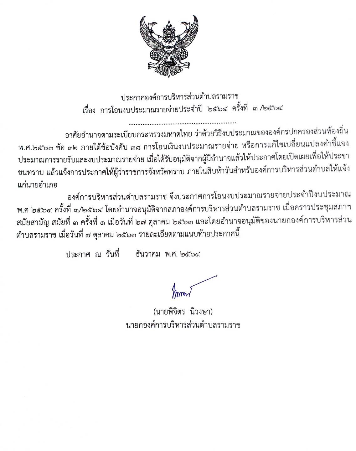 การโอนเงินงบประมาณรายจ่ายประจำปี 2564 ครั้งที่ 3/2564