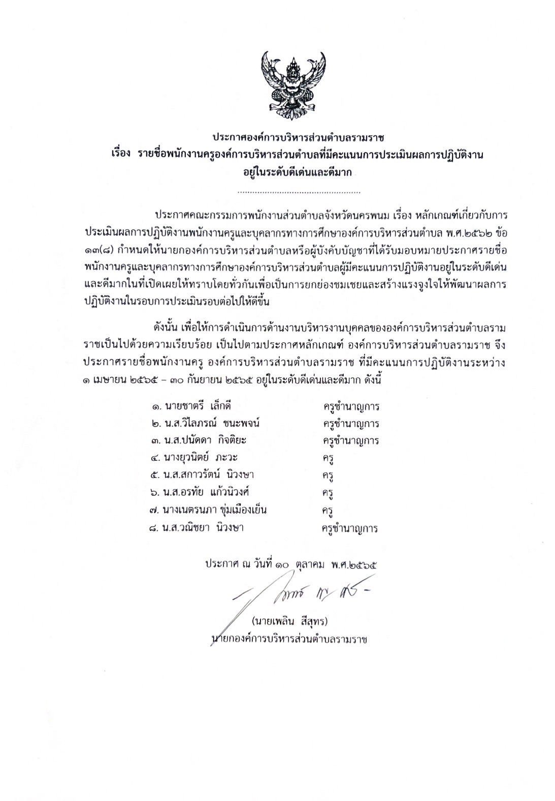 ประกาศองค์การบริหารส่วนตำบลรามราช เรื่อง รายชื่อพนักงานครูองค์การบริหารส่วนตำบลที่มีคะแนนการประเมินผลการปฏิบัติงานอยู่ในระดับดีเด่นและดีมาก
