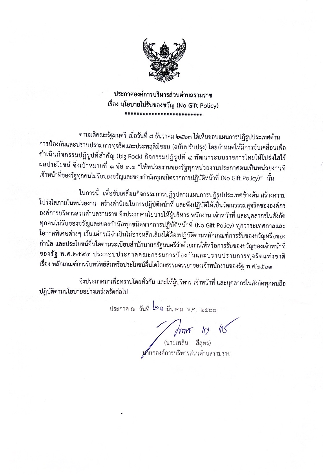 ประกาศองค์การบริหารส่วนตำบลรามราช เรื่อง นโยบายไม่รับของขวัญ (No Gift Policy)