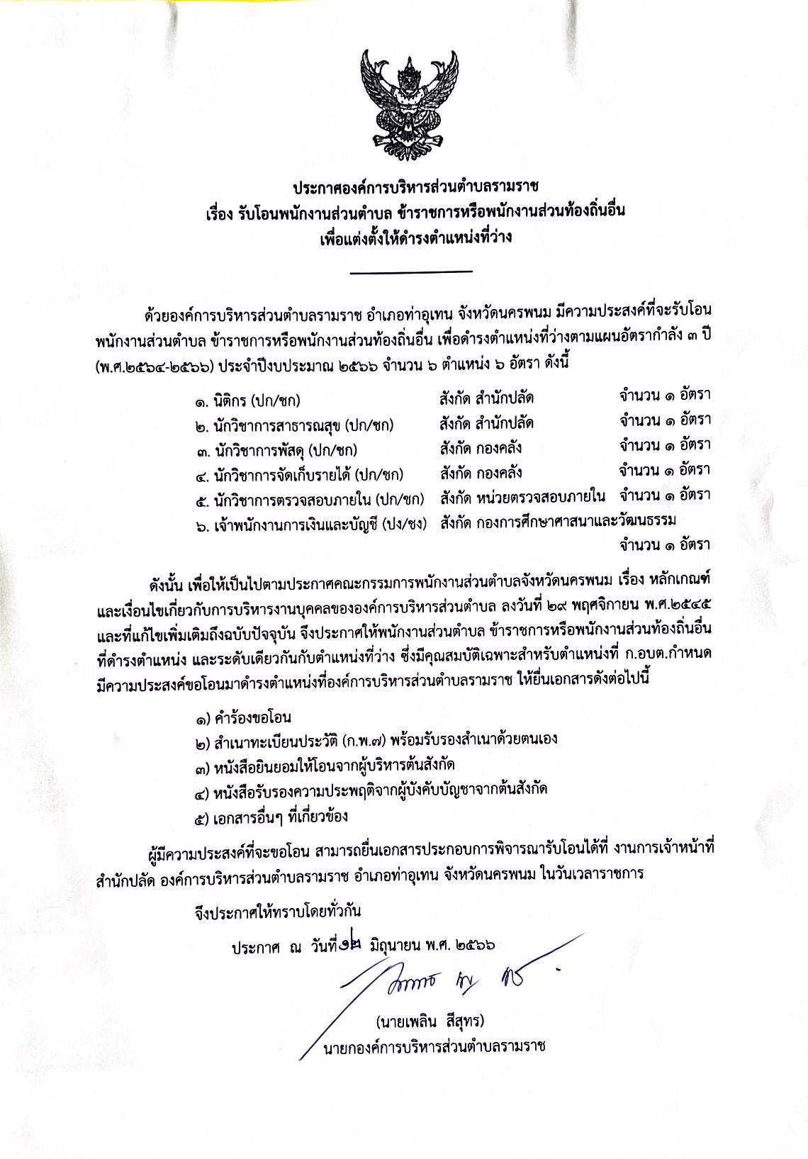 ประกาศองค์การบริหารส่วนตำบลรามราช เรื่อง รับโอนพนักงานส่วนตำบล ข้าราชการหรือพนักงานส่วนท้องถิ่นอื่น เพื่อแต่งตั้งให้ดำรงตำแหน่งที่ว่าง