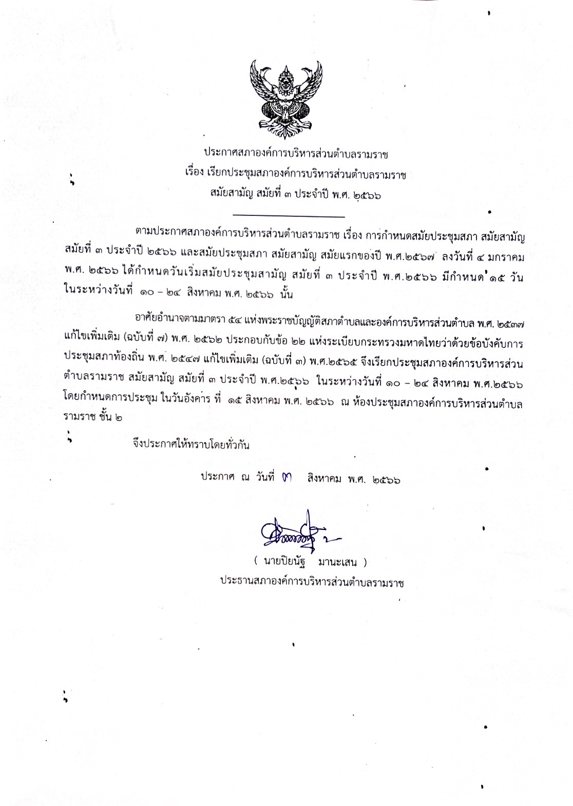ประกาศสภาองค์การบริหารส่วนตำบลรามราช เรื่อง เรียกประชุมสภาองค์การบริหารส่วนตำบลรามราช สมัยสามัญ สมัยที่ 3 ประจำปี พ.ศ.2566