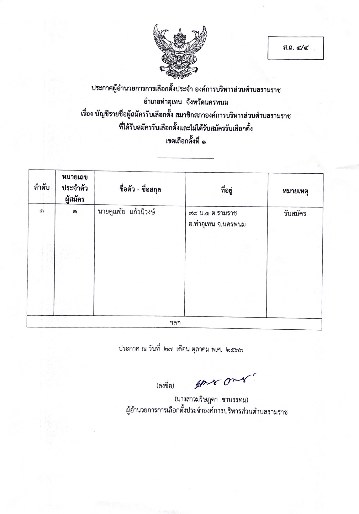 ประกาศผู้อำนวยการการเลือกตั้งประจำ องค์การบริหารส่วนตำบลรามราช อำเภอท่าอุเทน จังหวัดนครพนม เรื่อง บัญชีรายชื่อผู้สมัครรับเลือกตั้ง สมาชิกองค์การบริหาร