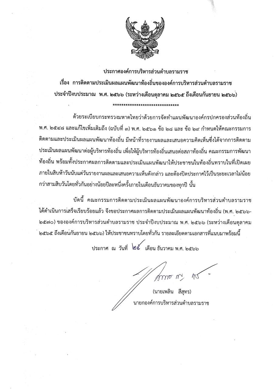 รายงานผลการติดตามประเมินผลแผนพัฒนาท้องถิ่น (พ.ศ. 2566-2570) ประจำปีงบประมาณ พ.ศ. 2566