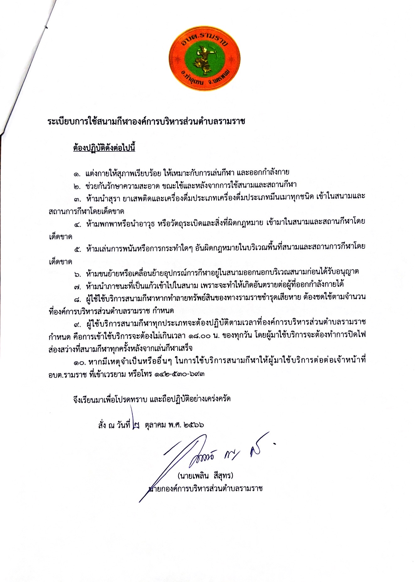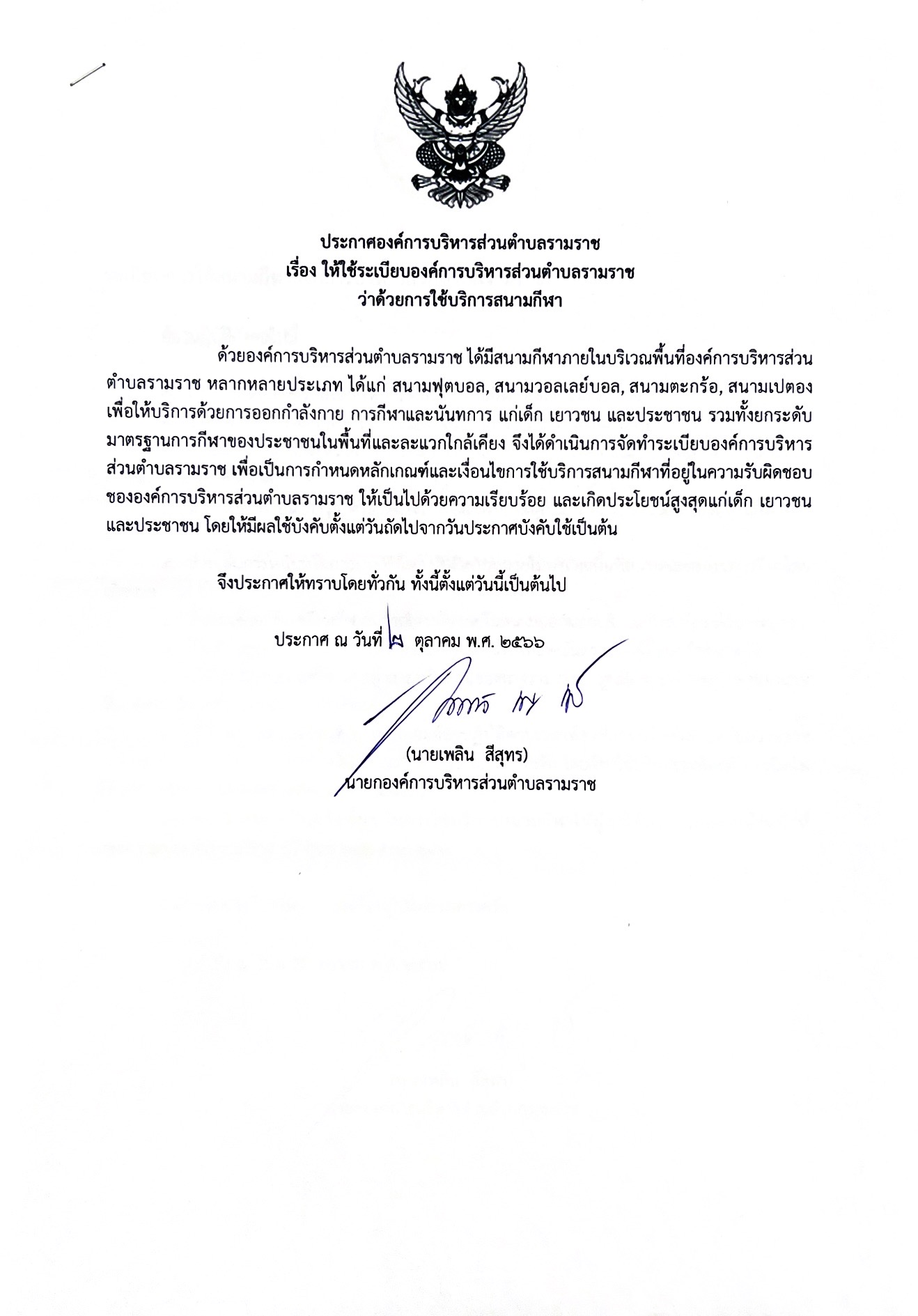 ประกาศองค์การบริหารส่วนตำบลรามราช เรื่อง ให้ใช้ระเบียบองค์การบริหารส่วนตำบลรามราชว่าด้วยการใช้บริการสนามกีฬา