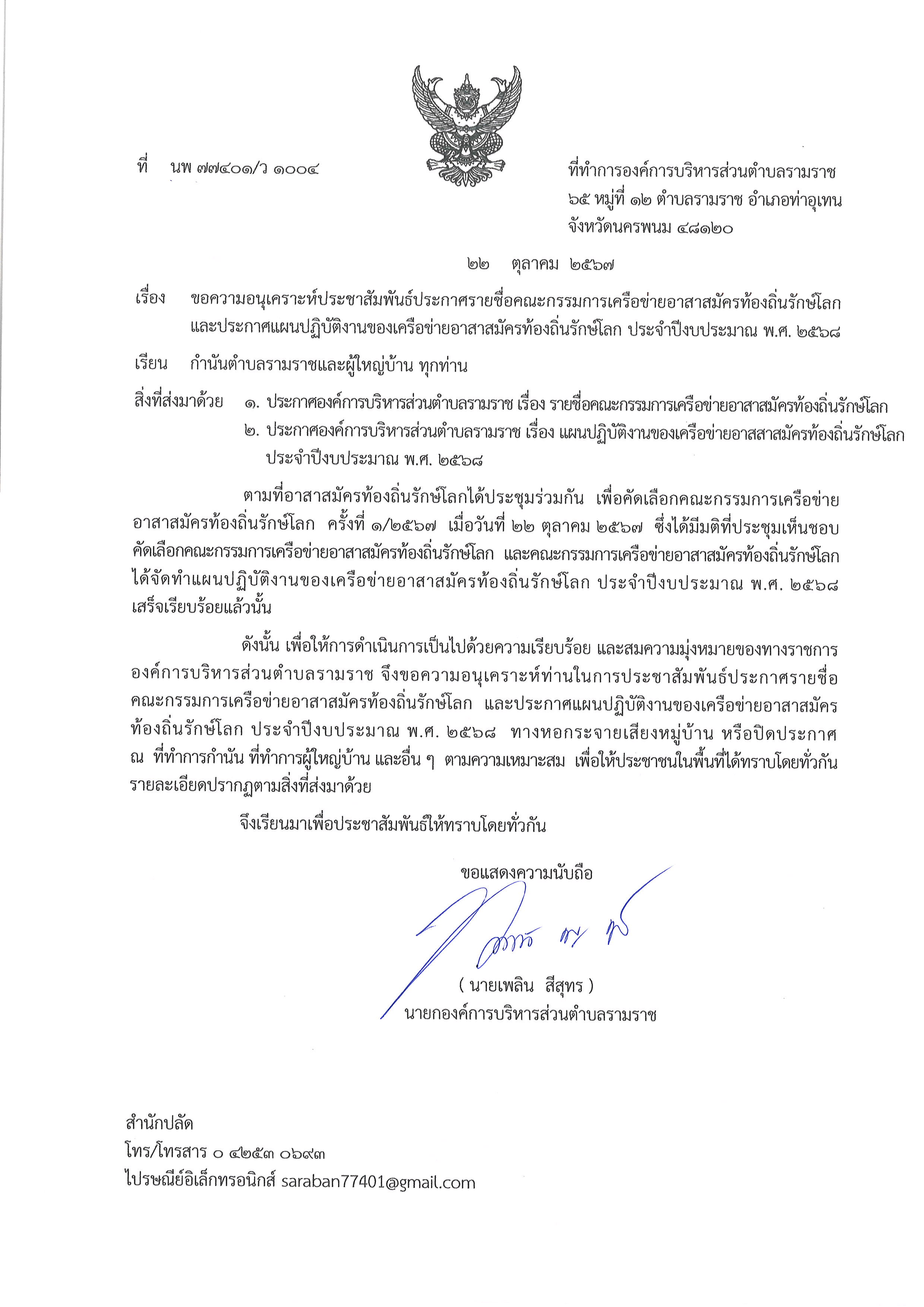 -ประชาสัมพันธ์- ขอความอนุเคราะห์ประชาสัมพันธ์ประกาศรายชื่อคณะกรรมการเครือข่ายอาสาสมัครท้องถิ่นรักษ์โลกและประกาศแผนปฏิบัติงานของเครือข่ายอาสาสมัครท้องถ