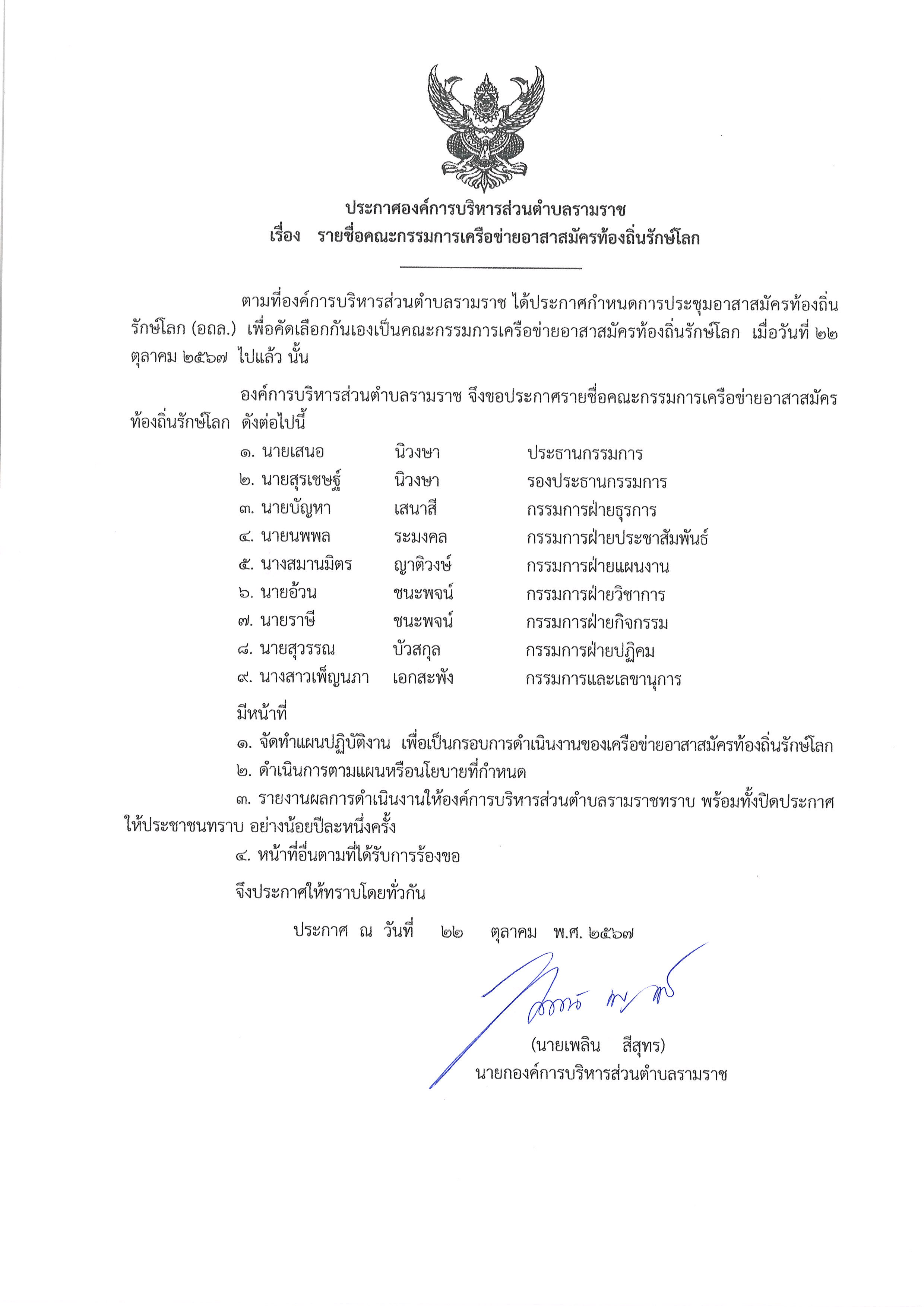 ประกาศองค์การบริหารส่วนตำบลรามราช เรื่อง รายชื่อคณะกรรมการเครือข่ายอาสาสมัครท้องถิ่นรักษ์โลก