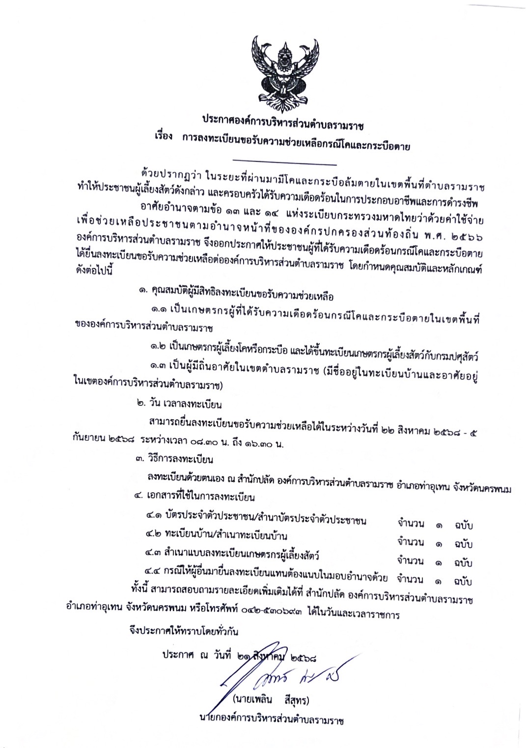 ประกาศองค์การบริหารส่วนตำบลรามราช เรื่อง การลงทะเบียนรับความช่วยเหลือกรณีโคกระบือตาย