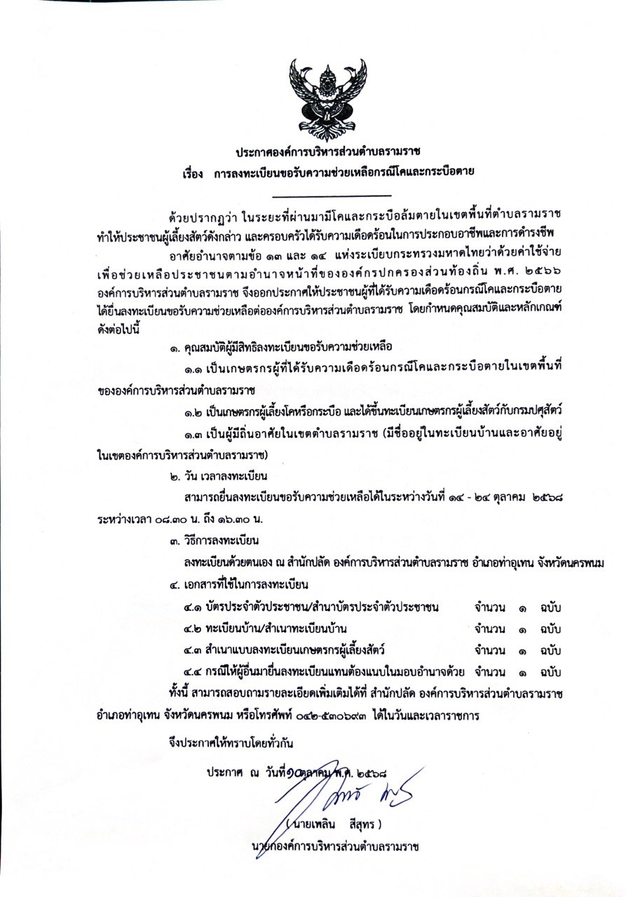 ประกาศองค์การบริหารส่วนตำบลรามราช เรื่อง การลงทะเบียนขอรับความช่วยเหลือกรณีโคและกระบือตาย