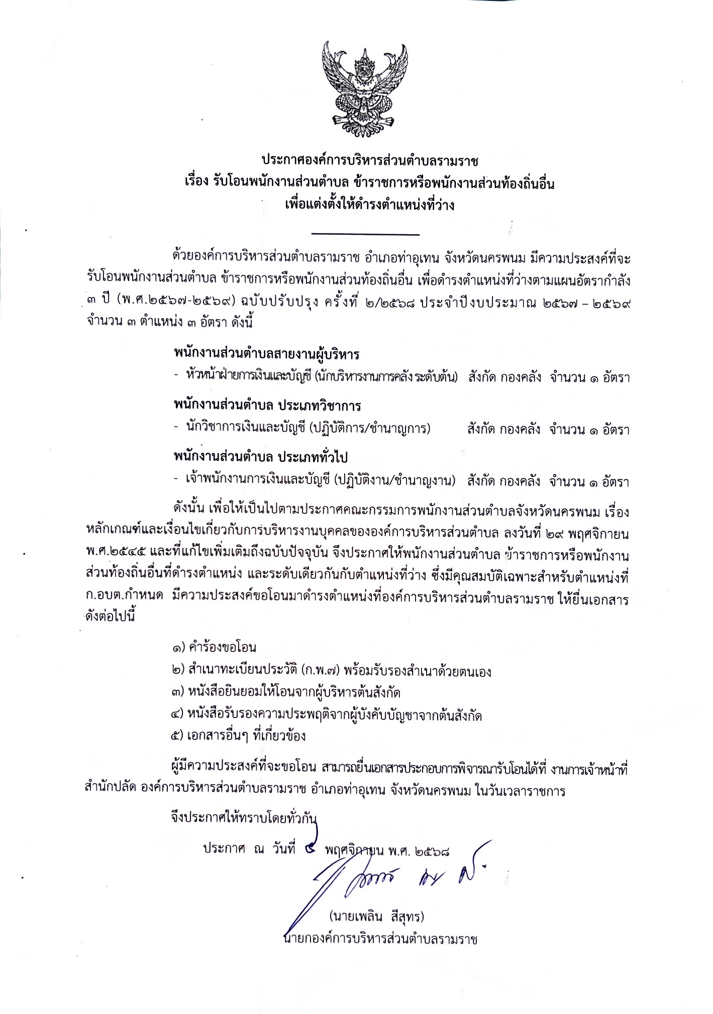 ประกาศองค์การบริหารส่วนตำบลรามราช เรื่อง รับโอนพนักงานส่วนตำบล ข้าราชการหรือพนักงานส่วนท้องถิ่นอื่น เพื่อแต่งตั้งให้ดำรงตำแหน่งที่ว่าง