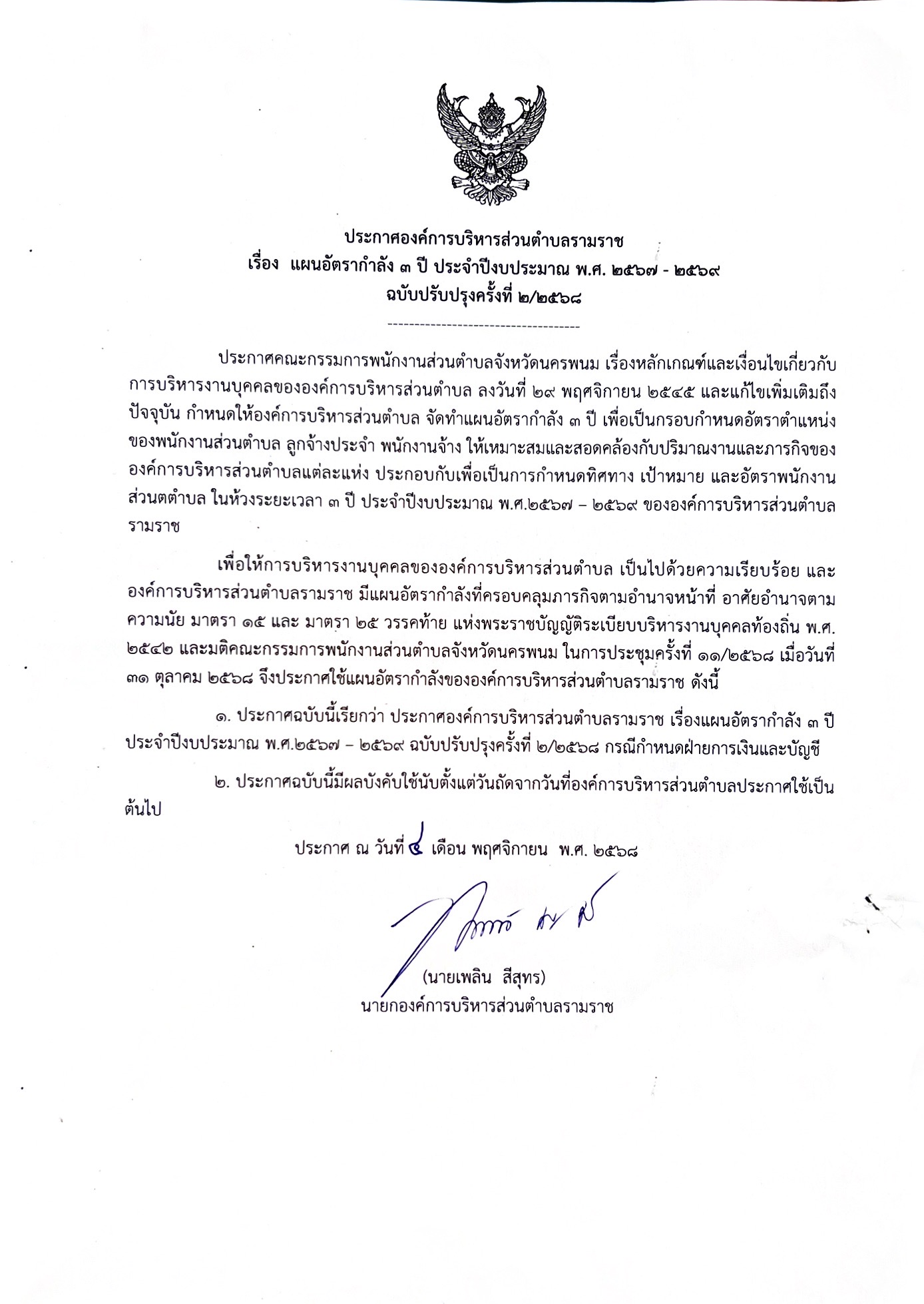 ประกาศองค์การบริหารส่วนตำบลรามราช เรื่อง แผนอัตรากำลัง 3 ปี ประจำปีงบประมาณ พ.ศ.2567-2569 ฉบับปรับปรุงครั้งที่ 2-2568