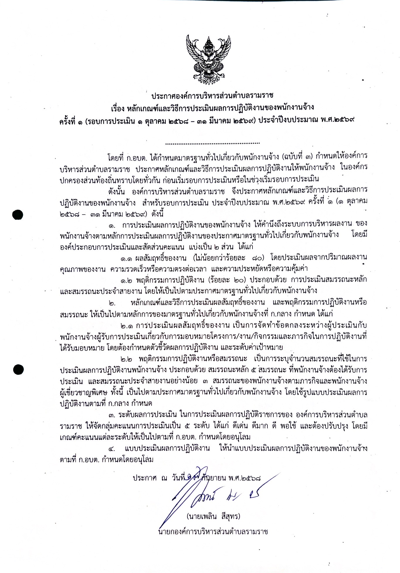 ประกาศองค์การบริหารส่วนตำบลรามราช เรื่อง หลักเกฑณ์และวิธีการประเมินผลการปฏิบัติงานของพนักงานจ้าง ครั้งที่ 1 (รอบการประเมิน 1 ตุลาคม 2568 - 31 มีนาคม 2