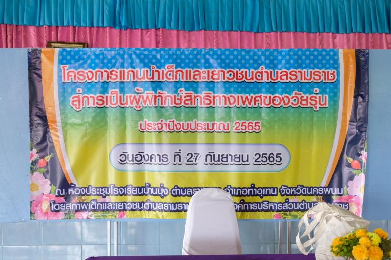 โครงการแกนนำเด็กและเยาวชนตำบลรามราช สู่การเป็นผู้พิทักษ์สิทธิทางเพศของวัยรุ่น ประจำปีงบประมาณ 2565 วันอังคาร ที่ 27 กันยายน 2565 ณ ห้องประชุมโรงเรียนบ้านนุ่ง ตำบลรามราช อำเภอท่าอุเทน จังหวัดนครพนม